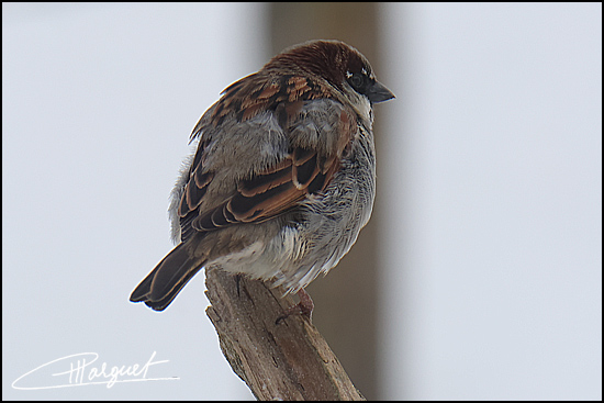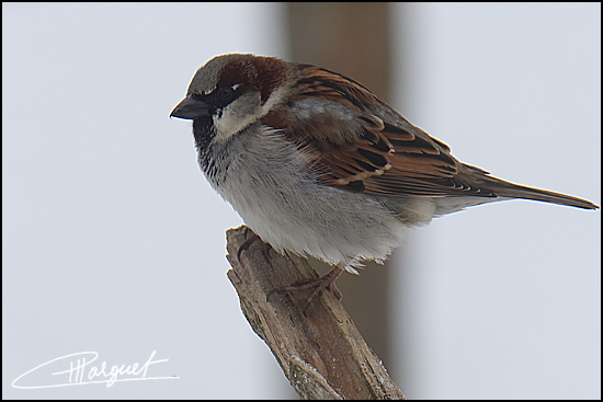 Moineau domestique mâle (avec plusieurs plumes blanches)